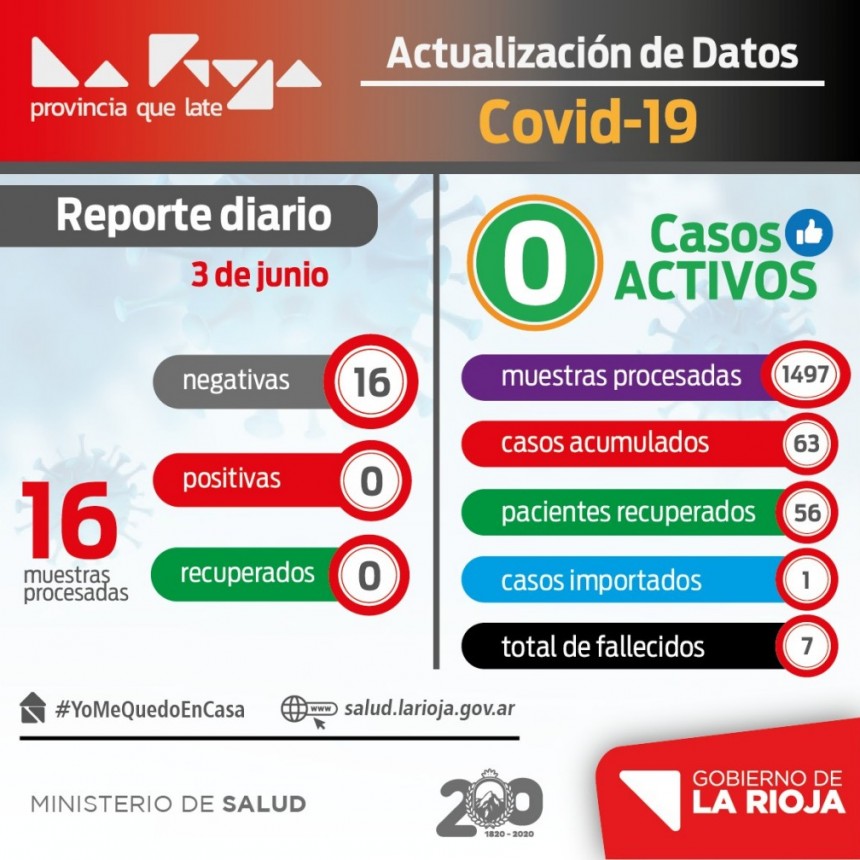 En el informe diario, el gobierno de la provincia informa que se llevan realizadas 1.366 muestras para COVID-19 y solo 63 resultaron positivas desde que se inició la pandemia. Este martes, se procesaron 20 muestras, resultando todas negativas para COVID-19, y se reportaron dos personas más que superaron la enfermedad, con lo cual ya son 52 los pacientes recuperados y solo quedan 4 personas con coronavirus.