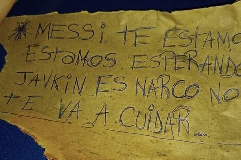 Fuentes policiales informaron que dejaron una nota extorsiva en un papel que decía: "Messi, te estamos esperando. Javkin también es narco, no te va a cuidar”, dice el texto escrito con birome en un cartón, en referencia también al intendente rosarino, Pablo Javkin.