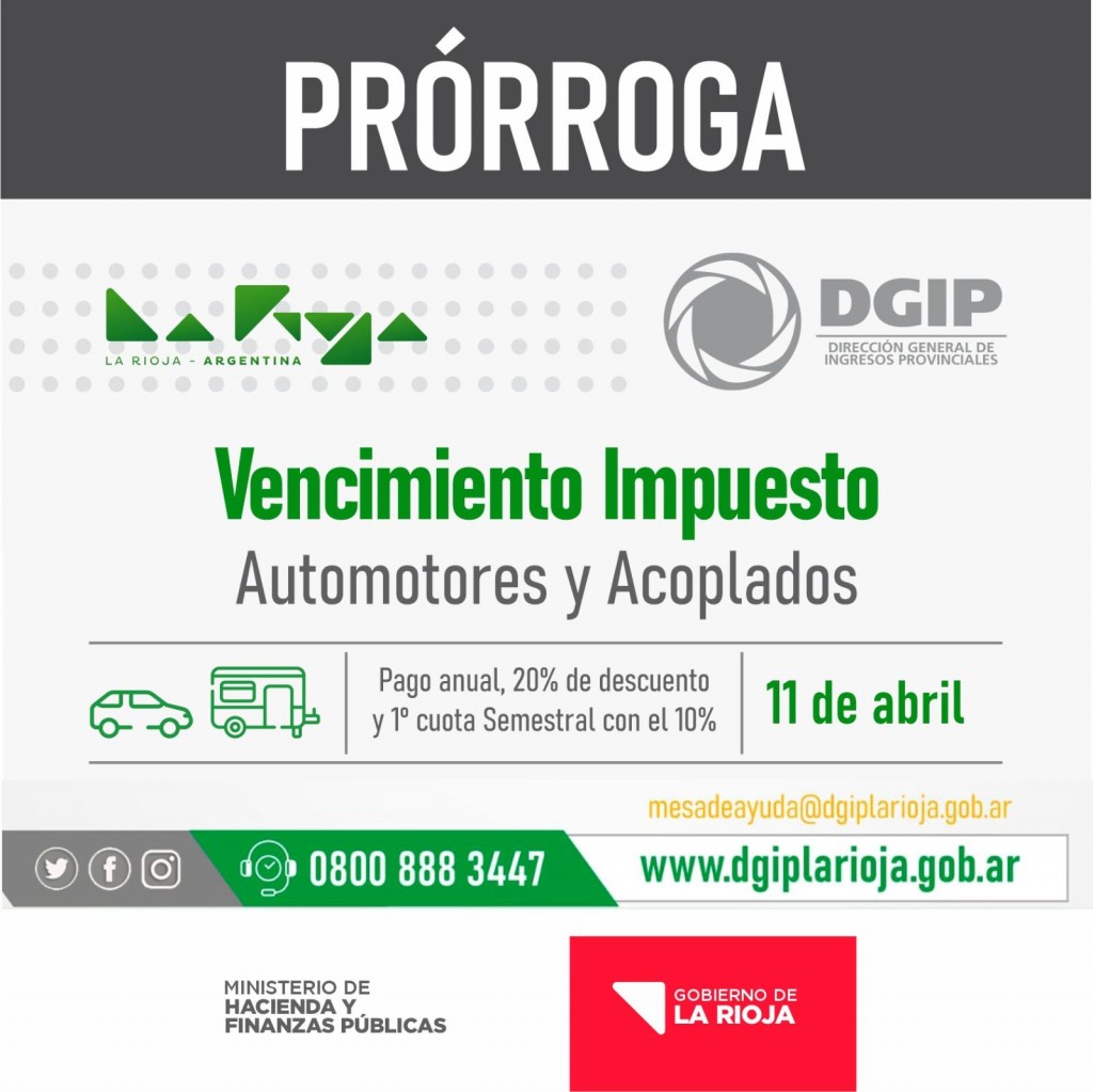 El Ministerio de Hacienda y Finanzas Públicas, a través de la Dirección General de Ingresos Provinciales (DGIP), comunica que decidió prorrogar hasta el 11 de Abril, el vencimiento del Impuesto a los Automotores y Acoplados del período 2023.