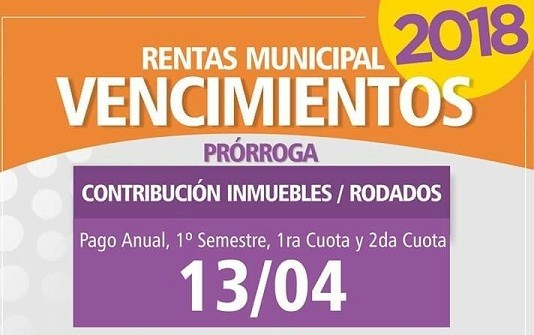 La Municipalidad de La Rioja, a través de la Dirección General de Rentas Municipal, comunica que la prórroga de vencimiento de la tasa que incide sobre inmueble y rodado en general, se extenderá hasta el día 13 de abril del corriente año.