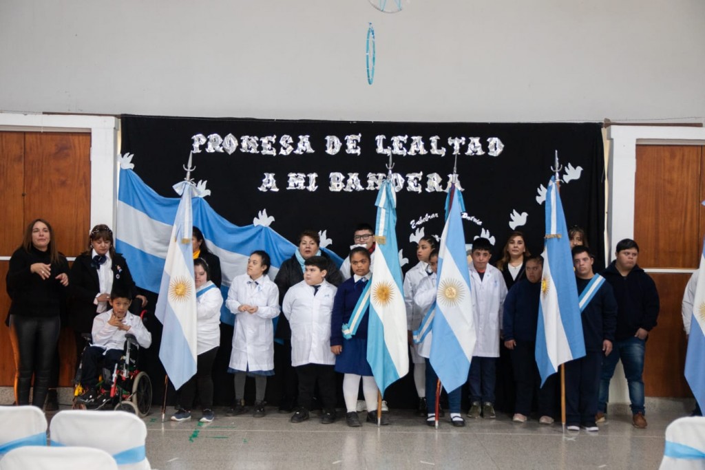 En un acto que se llevó a cabo este jueves en la esc N° 389 "Tinkunaco" alumnos y alumnas de las escuelas de la modalidad de Educación Especial prometieron lealtad a la bandera argentina. Los de Capital participaron de manera presencial, mientras que las escuelas de Chamical y Chilecito lo hicieron vía online.