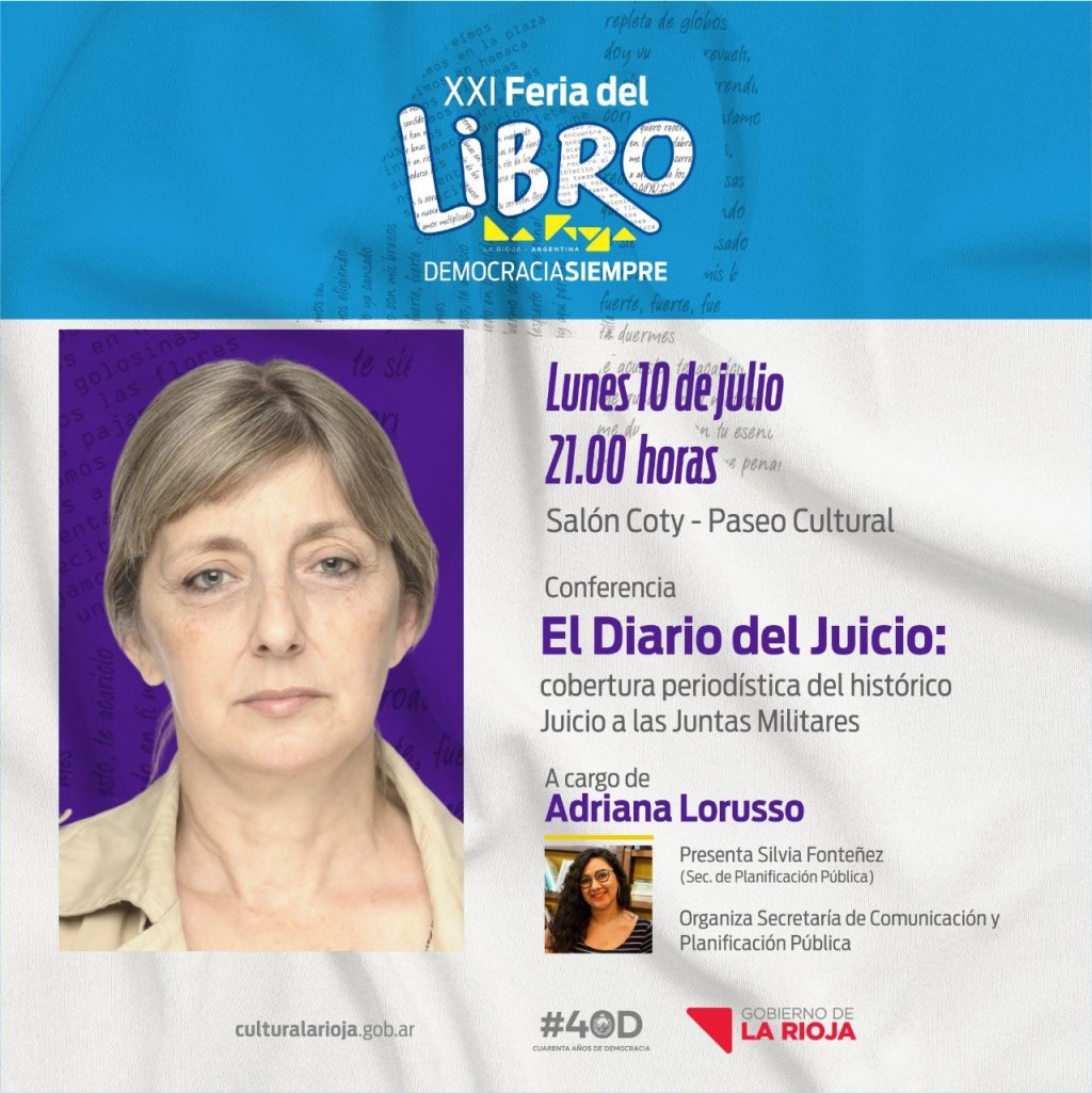 En el marco de las propuestas que la Secretaría de Comunicación y Planificación Pública ofrece en sus espacios de la Feria del Libro 2023 – Democracia Siempre, dictará este lunes 10 a partir de las 21 horas en el Salón Coty Agost del Paseo Cultural, la conferencia “El Diario del Juicio: cobertura periodística del histórico Juicio a las Juntas Militares”, de Adriana Larusso.