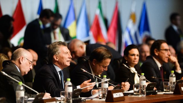 Macri hizo un llamado a "redoblar los esfuerzos para que el gobierno de Venezuela deje de negar la realidad y acepte la colaboración regional y la ayuda internacional que permitan superar esta crisis humanitaria, que se ha vuelto insostenible". En otro de sus pasajes críticos con el gobierno de Maduro, el Presidente consideró que "el caso de Venezuela muestra en extremo a lo que puede llevar a una sociedad un proceso de corrupción descontrolado".