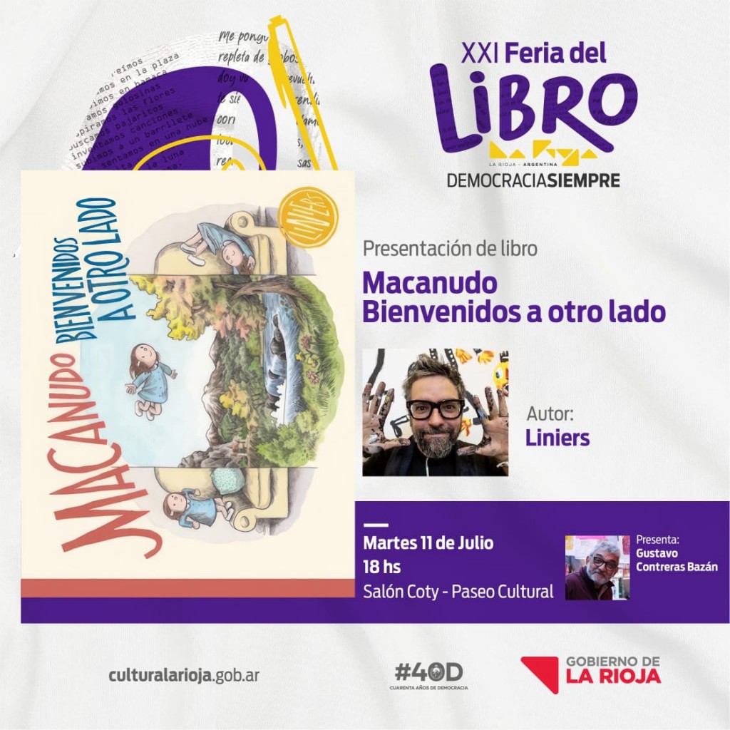 Esta tarde, a las 18 horas en el Salón Coty del Paseo Cultural, el historietista Liniers presentará “Macanudo. Bienvenidos a otro lado” en la Feria del Libro La Rioja 2023 – “Democracia Siempre”, y su presentación contará con el sorteo de ejemplares del mismo.