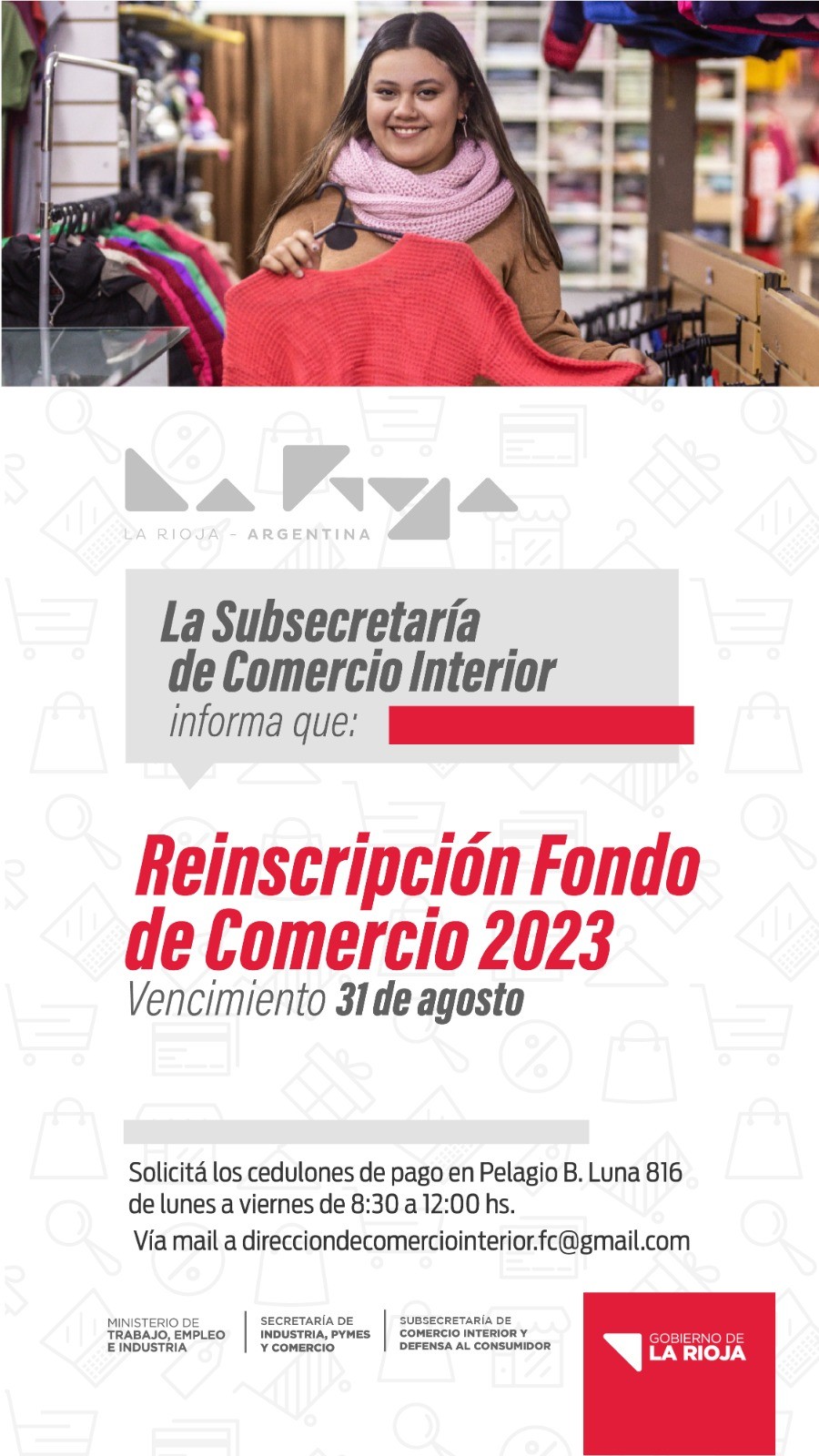 La Secretaría de Industria y de la Subsecretaría de Comercio Interior, informan que se encuentra disponible la Reinscripción 2023 del Fondo de Comercio destinada a comerciantes y prestadores de servicios, con vencimiento al 31 de Agosto del corriente año.