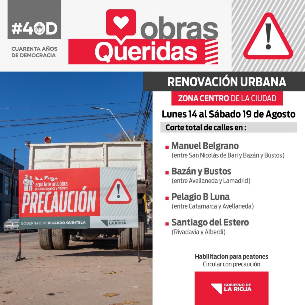 En ese sentido se informó que en las calles Manuel Belgrano entre San Nicolás de Bari y Bazán y Bustos. Además de Bazán y Bustos entre Avellaneda y Lamadrid; Pelagio B Luna entre Catamarca y Avellaneda. Santiago del Estero entre Rivadavia y Alberdi. Se encuentra interrumpido el tránsito vehicular esta semana.