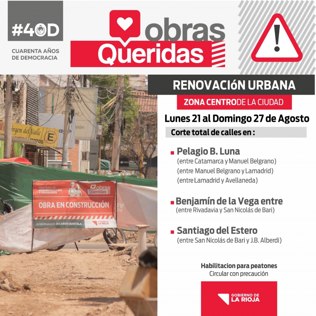 Por tal motivo, se informa que las calles céntricas que se verán interrumpidas esta semana por la obra son: Bazán y Bustos (entre Avellaneda y Lamadrid), Santiago del estero (entre Juan Bautista Alberdi y San Nicolás de Bari) y Pelagio B. Luna (entre Catamarca y 25 de Mayo - con paso continuo al sur por Manuel Belgrano - y Joaquín V. González y Avellaneda – con paso hacia el norte por Lamadrid).