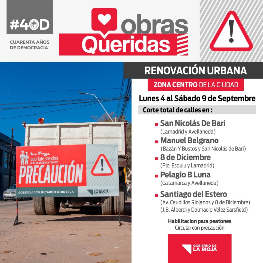 El Gobierno de La Rioja comunica el cronograma de cortes de calles por las obras de Renovación Urbana y Desagües Pluviales del área central de la ciudad Capital, previstos desde el lunes 4 al sábado 9 de septiembre, con la intención de que la ciudadanía busque vías alternativas, tanto para ingresar como para salir del centro de la ciudad.