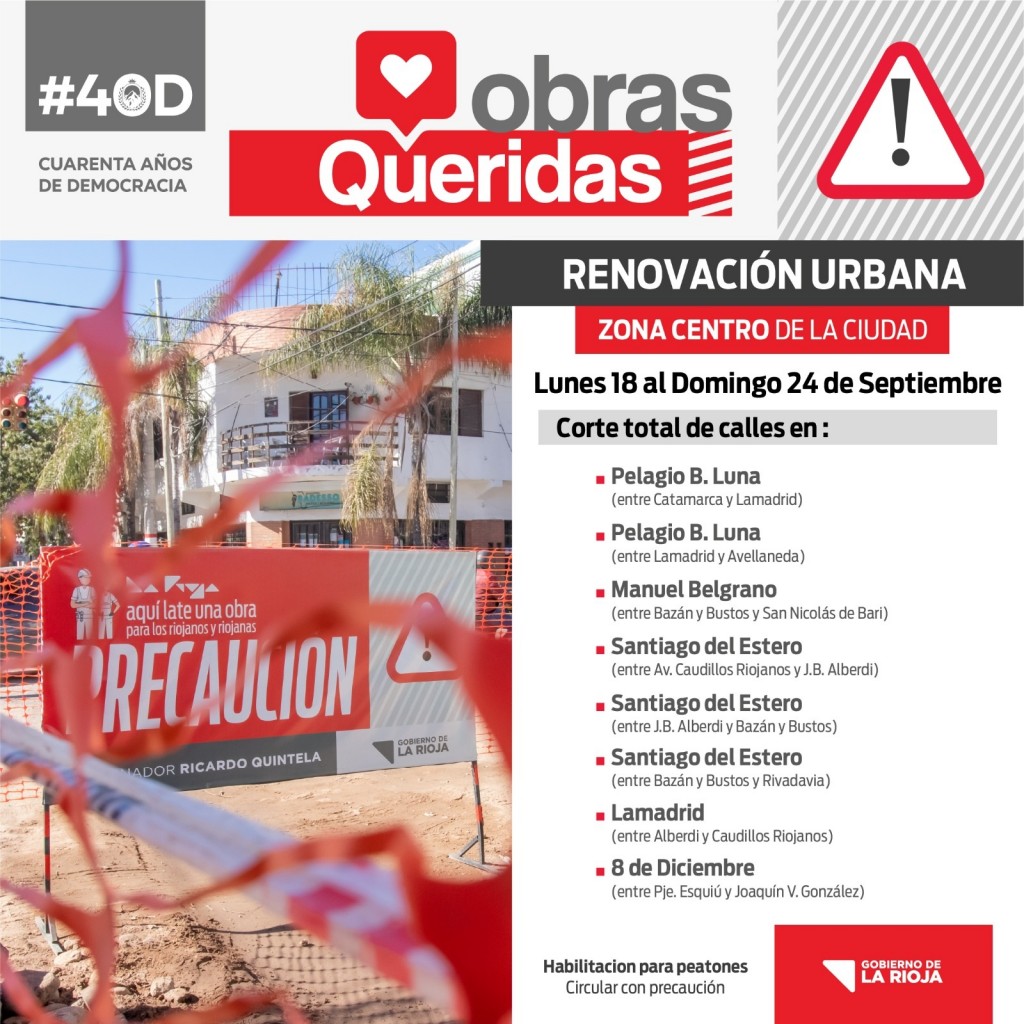 Se informo que continúan los cortes de tránsito en las calles: Benjamín De La Vega (entre San Nicolás de Bari y Av. Victoria Romero – ex Rivadavia), 8 de Diciembre (entre Pasaje Esquiú y Joaquín V. González), Manuel Belgrano (entre Bazán y Bustos y San Nicolás de Bari), San Nicolás de Bari (entre Güemes y Lamadrid), Pelagio B. Luna (entre Catamarca y Avellaneda, con paso hacia el Norte por Lamadrid) y en Santiago del Estero (entre Av. Caudillos Riojanos y Av. Victoria Romero , con paso al Oeste por Bazán y Bustos y hacia el Este por Juan Bautista Alberdi).
