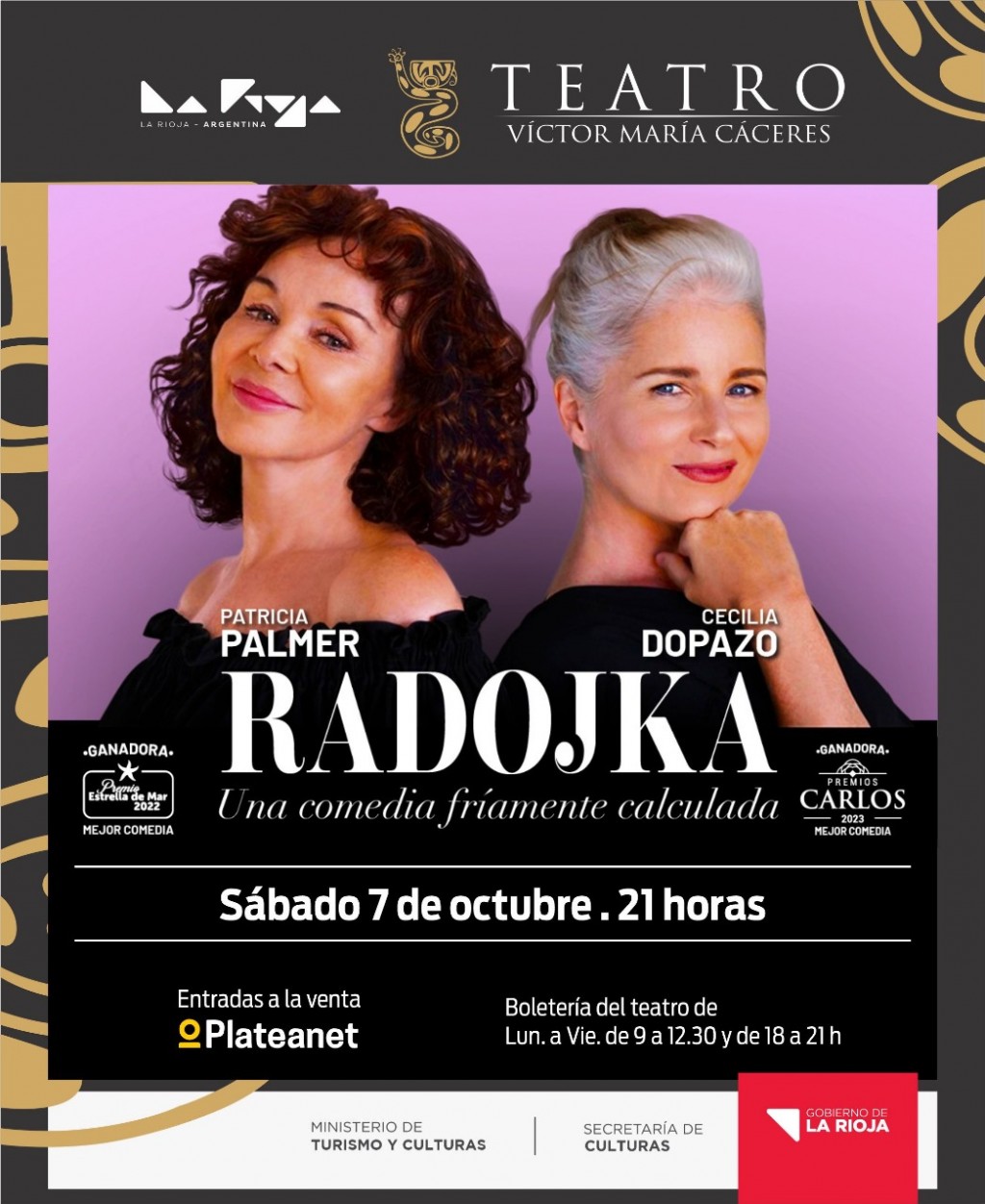 "Radojka. Una comedia fríamente calculada", una comedia protagonizada por Patricia Palmer y Cecilia Dopazo, se pondrá en escena el sábado 7 de octubre a las 21 horas. Es una comedia apta para todo público, a partir de los dos años. Las entradas tienen un valor que va desde los $6000 y ya se encuentran a la venta en boletería del Teatro Víctor María Cáceres de 9 a 12.30 horas y de 18 a 21 horas, o de manera online en https://www.plateanet.com/obra/27237?obra=RADOJKA--UNA-COMEDIA-FRIAMENTE-CALCULADA&paso=inicio