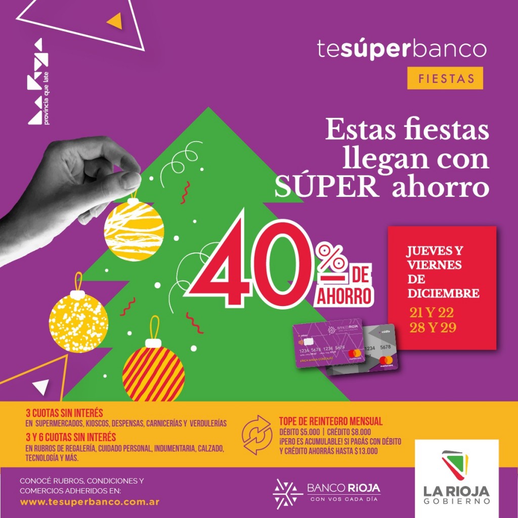 El Banco Rioja, junto al Gobierno provincial, lanzó la promoción bancaria “Te Súper Banco Fiestas”, que permitirá ahorrar hasta $13.000 durante el mes de diciembre en comercios adheridos de la Provincia.