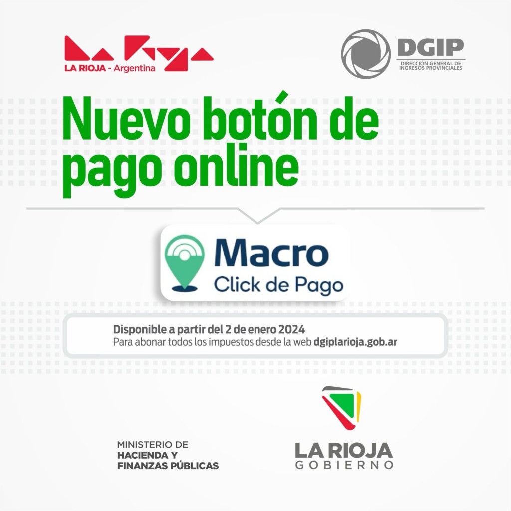 La Dirección General de Ingresos Provinciales informa que añadió una nueva opción de pago en línea mediante la web dgiplarioja.gob.ar, la misma es a través de Macro Click y estará disponible a partir del martes 2 de enero.