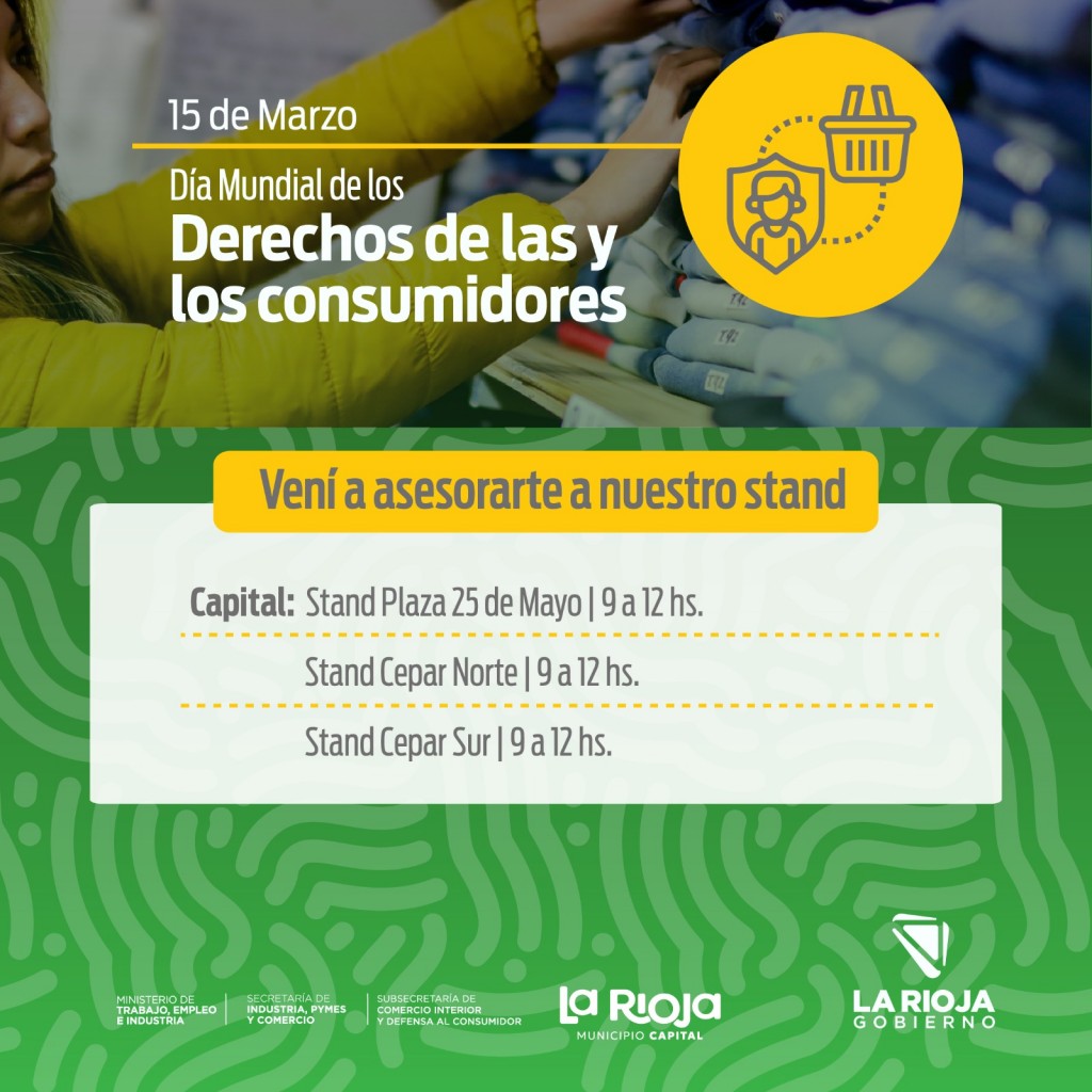 La Subsecretaría de Comercio Interior y Defensa al Consumidor, dependiente del Ministerio de Trabajo, Empleo e Industria de La Rioja, realizará actividadesen Capital y el interior para conmemorar el Día Mundial de los Derechos de las y los Consumidores.