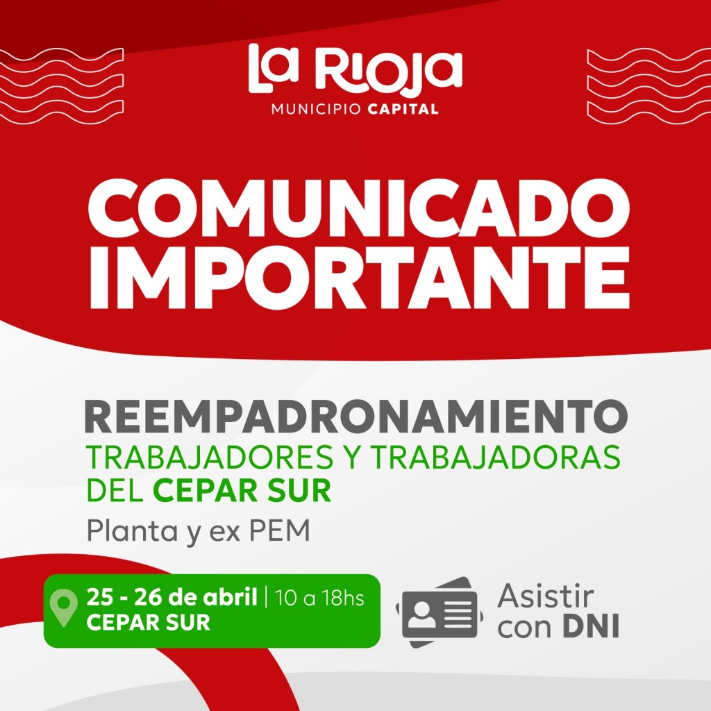 El Municipio Capital, realizará hoy y mañana de 10 a 18hs, el reempadronamiento del personal de planta permanente y Ex PEM del Cepar Sur.