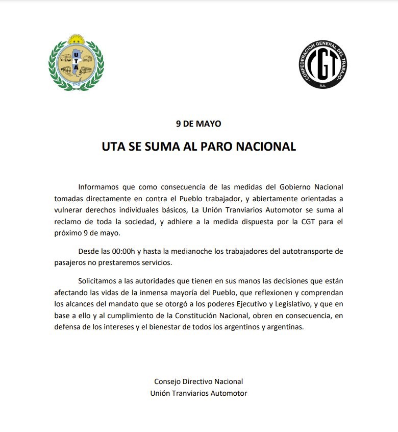 “Informamos que como consecuencia de las medidas del Gobierno Nacional tomadas directamente en contra el Pueblo trabajador, y abiertamente orientadas a vulnerar derechos individuales básicos, La Unión Tranviarios Automotor se suma al reclamo de toda la sociedad, y adhiere a la medida dispuesta por la CGT para el próximo 9 de mayo”, dice un comunicado del gremio difundido esta noche.