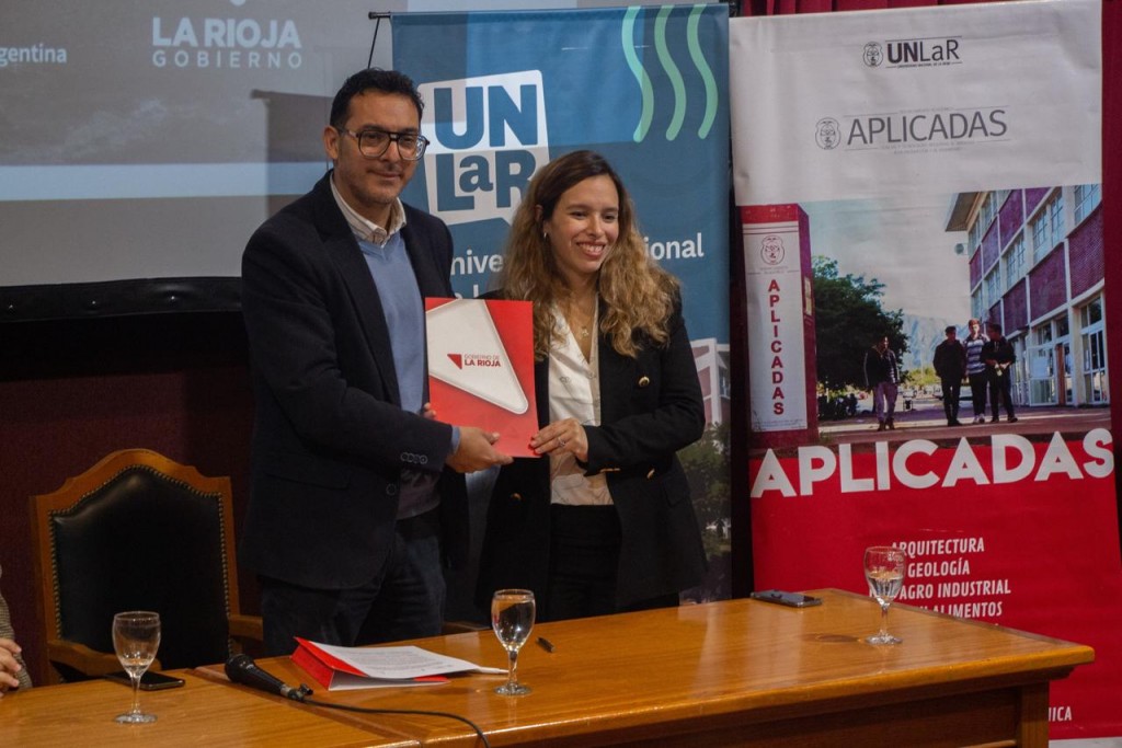 En la Sala Roja del microcine de la Universidad Nacional de la Rioja, la secretaria de Minería, María Ivanna Guardia, y el decano del Departamento de Ciencias y Tecnologías Aplicadas a la Producción, al Ambiente y al Urbanismo (DACyTAPAU), Ing. Luis Oviedo, llevaron a cabo la firma de un acta compromiso para la firma de un Convenio Marco y específico de Cooperación Institucional entre la Secretaría de Minería y el DACyTAPAU de la UNLaR.