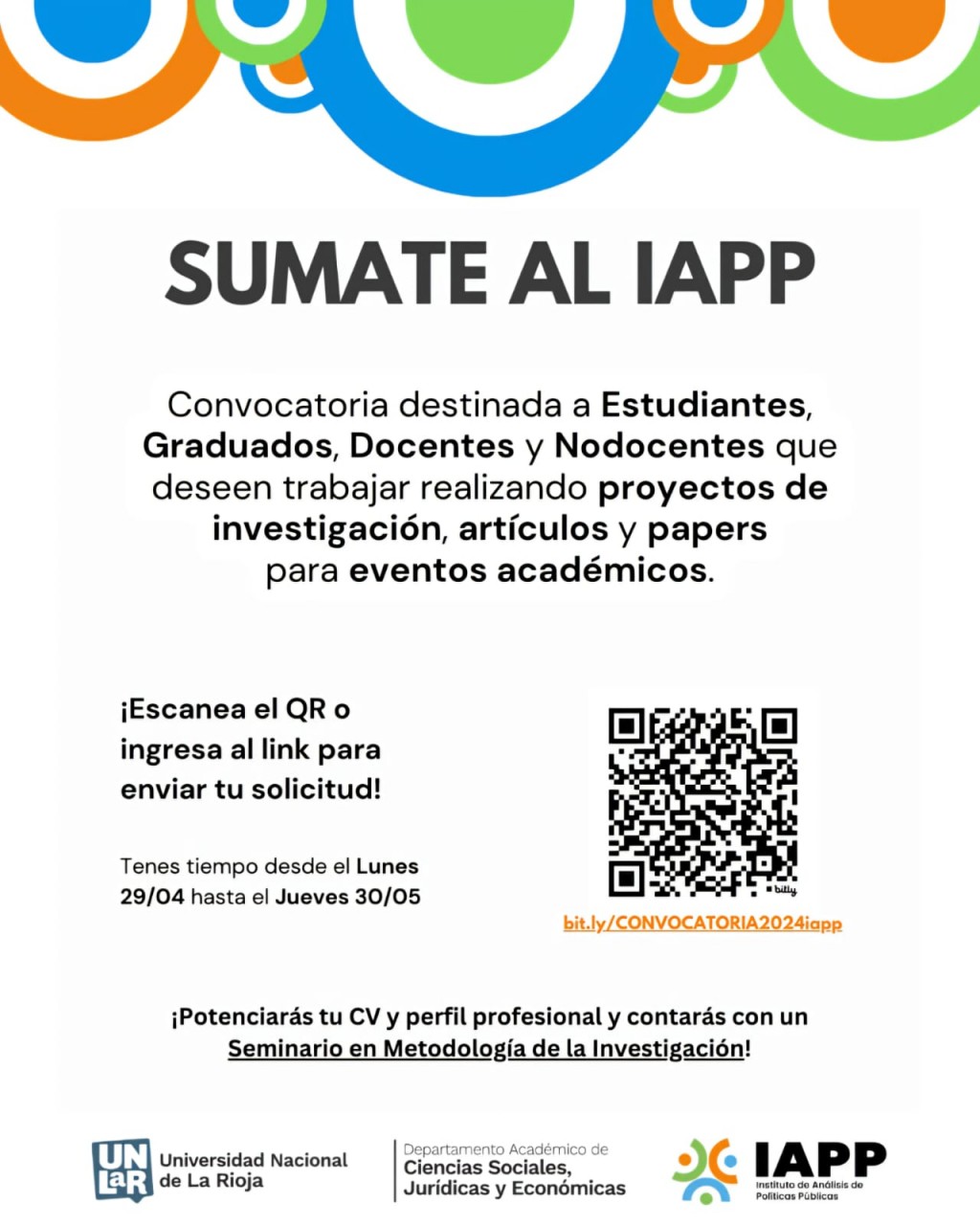 Las inscripciones se extenderán hasta el 30 de mayo. Para inscribirse, solo hace falta acceder al enlace disponible en la biografía de las redes sociales del IAPP (instituto.iapp.unlar en instagram e Instituto de analisis de politicas publicas UNLaR en facebook) o escanear el código QR que se encuentra en la promoción.