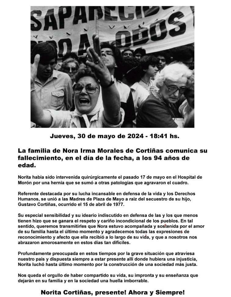 "La familia de Nora Irma Morales de Cortiñas comunica su fallecimiento, en el día de la fecha, a los 94 años de edad. Norita había sido intervenida quirúrgicamente el pasado 17 de mayo en el hospital de Morón por una hernia que se sumó a otras patologías que agravaron su cuadro", reza el comunicado familiar de la titular de Madres de Plaza de Mayo.