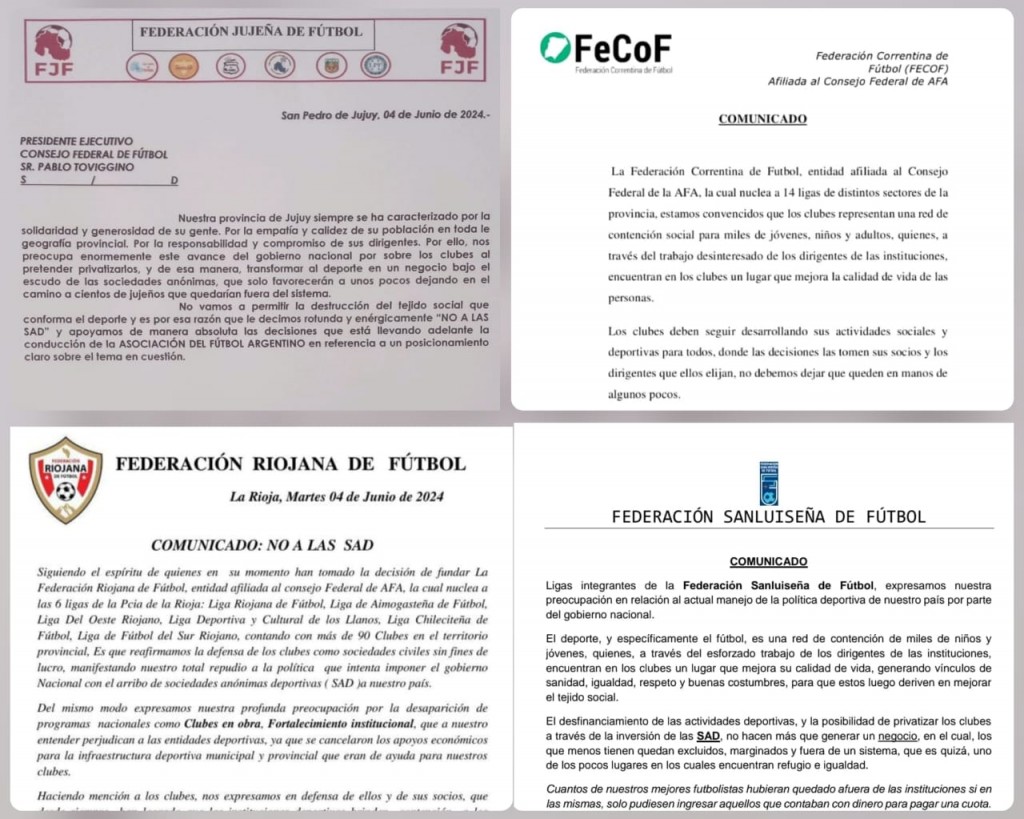 La Federación Correntina de Fútbol y sus 14 Ligas, la Federación Riojana y sus 6 Ligas, La Federación Sanluiseña y sus 4 Ligas y la Fed. Jujeña y sus 6 Ligas manifestaron mediante sendas notas el rechazó a las Sociedades Anónimas Deportivas (SAD).