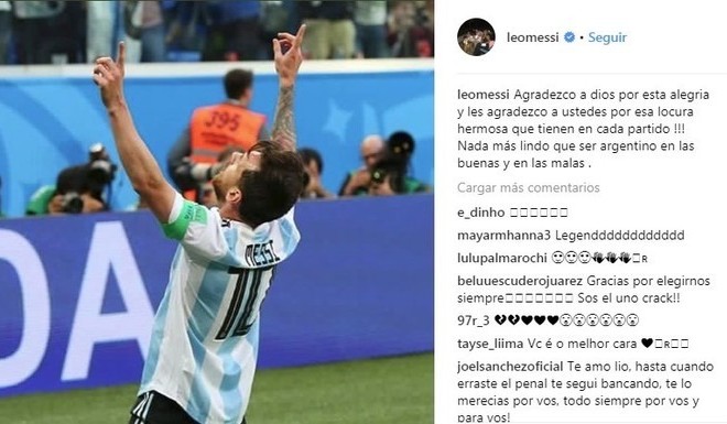 Lionel Messi vivió el partido contra Nigeria como lo que era, una verdadera final. De entrada se puso el equipo al hombro con ese golazo para el 1-0 e hizo cosas pocas veces vistas, como su arenga antes del arranque del ST. Post partido sostuvo que "pocas veces había sufrido tanto" y todo ese desahogo quedó reflejado en el posteo que hizo más tarde en Instagram, con la argentinidad al palo: "Agradezco a dios por esta alegría y les agradezco a ustedes por esa locura hermosa que tienen en cada partido !!! Nada más lindo que ser argentino en las buenas y en las malas". "¡Gracias a vos por ser argentino, nene!".