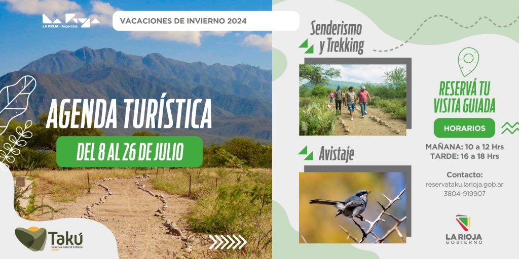 Asimismo se recomienda llevar calzado cómodo, agua para hidratarse y asistir con agenda previa. Para reservar lugar desde el 8 al 26 de julio, en los horarios de 10 a 12 hs y de 16 a 18 hs, ingresando a la página web de reservataku.larioja.gob.ar o al número 3804-919907.
