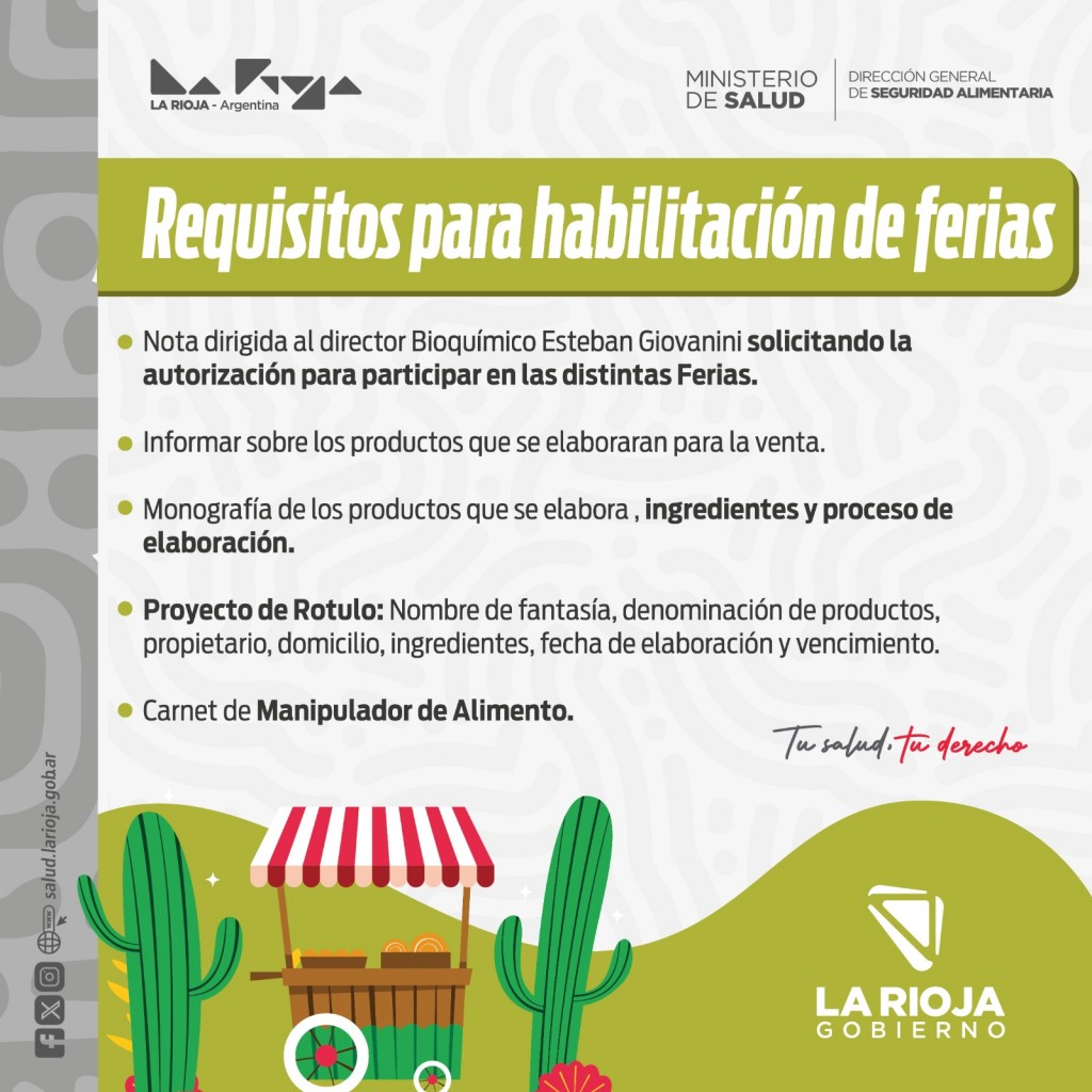 El director de Seguridad Alimentaria, Esteban Giovanini, explicó que ”los dueños de los puestos deben solicitar la autorización para participar en las distintas ferias e informar sobre los productos que se elaborarán para la venta y se debe incluir una monografía de los productos que se elaboran, con ingredientes y proceso de elaboración, el proyecto de rótulo con el nombre de fantasía, denominación de productos, propietario, domicilio, ingredientes, fecha de elaboración y vencimiento, y por último, el carné de manipulador de alimentos”.