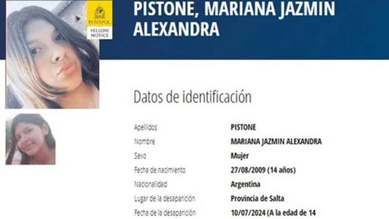 La Organización Internacional de Policía Criminal emitió una alerta amarilla en la búsqueda de la adolescente Mariana Jazmín Pistone que desapareció el 10 de julio pasado en la localidad salteña de Dragones, en el departamento de San Martín.