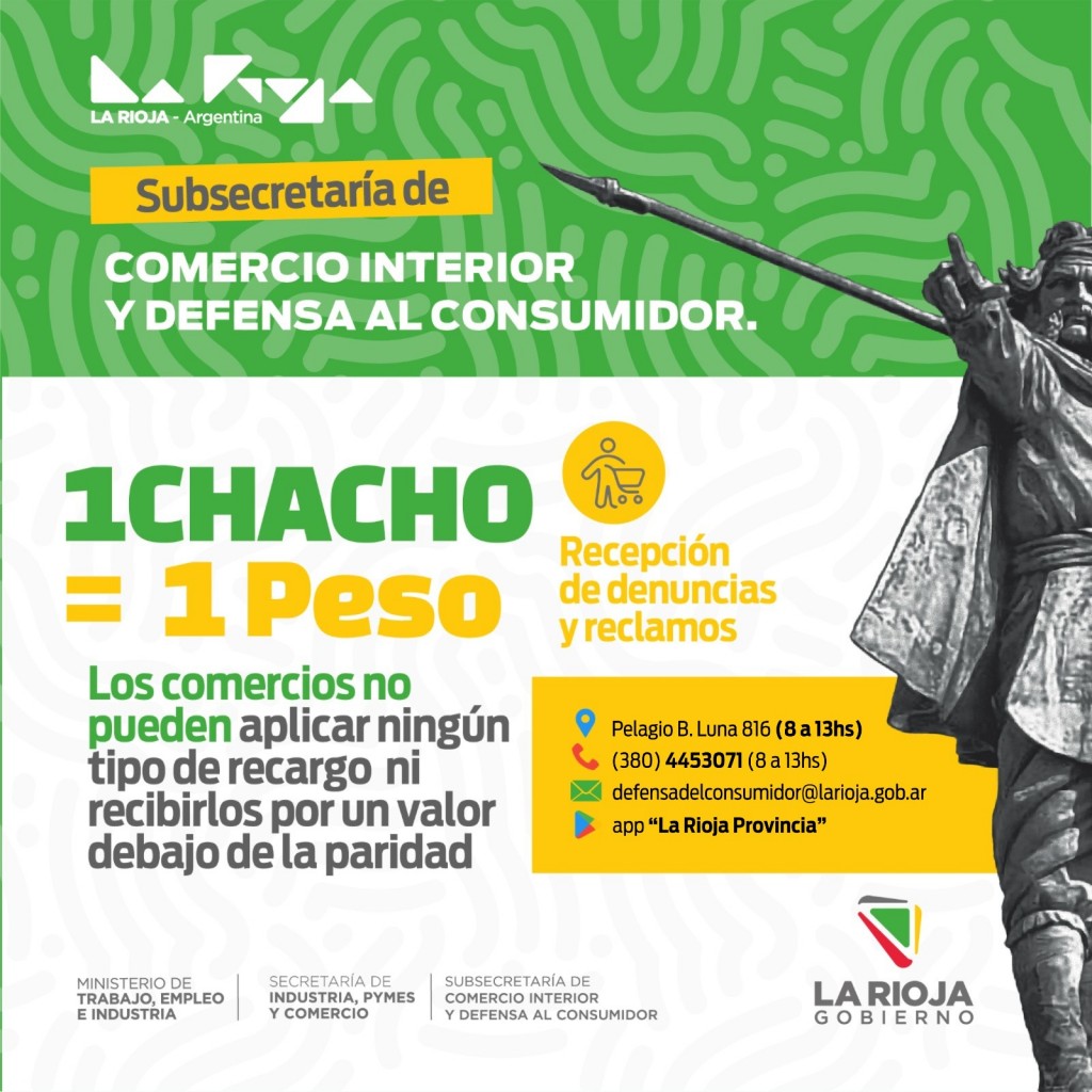 La subsecretaría de Comercio Interior y Defensa al Consumidor dispuso sitios virtuales y presenciales para denunciar irregularidades que perjudiquen a los consumidores o vayan en desmedro de la moneda local. Se aclara que 1 chacho, equivale a 1 peso y por ningun motivo deben aceptar que sean recibidos por menor valor o cobrarles algún recargo.