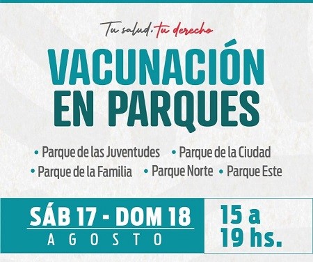 Se vacunará en los Parques de la Juventud, Norte y Este, mientras que en los Parques de la Familia y de la Ciudad se encontraran abiertos ambos vacunatorios. De esta manera se brindará cobertura sábado y domingo en los horarios de 15 a 19 hs.