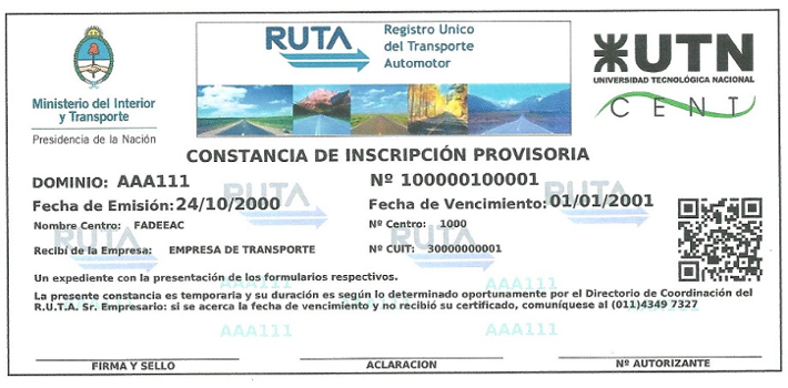Constancia de inscripción en el Registro Único Del Transporte Automotor (RUTA) en formato digital o físico