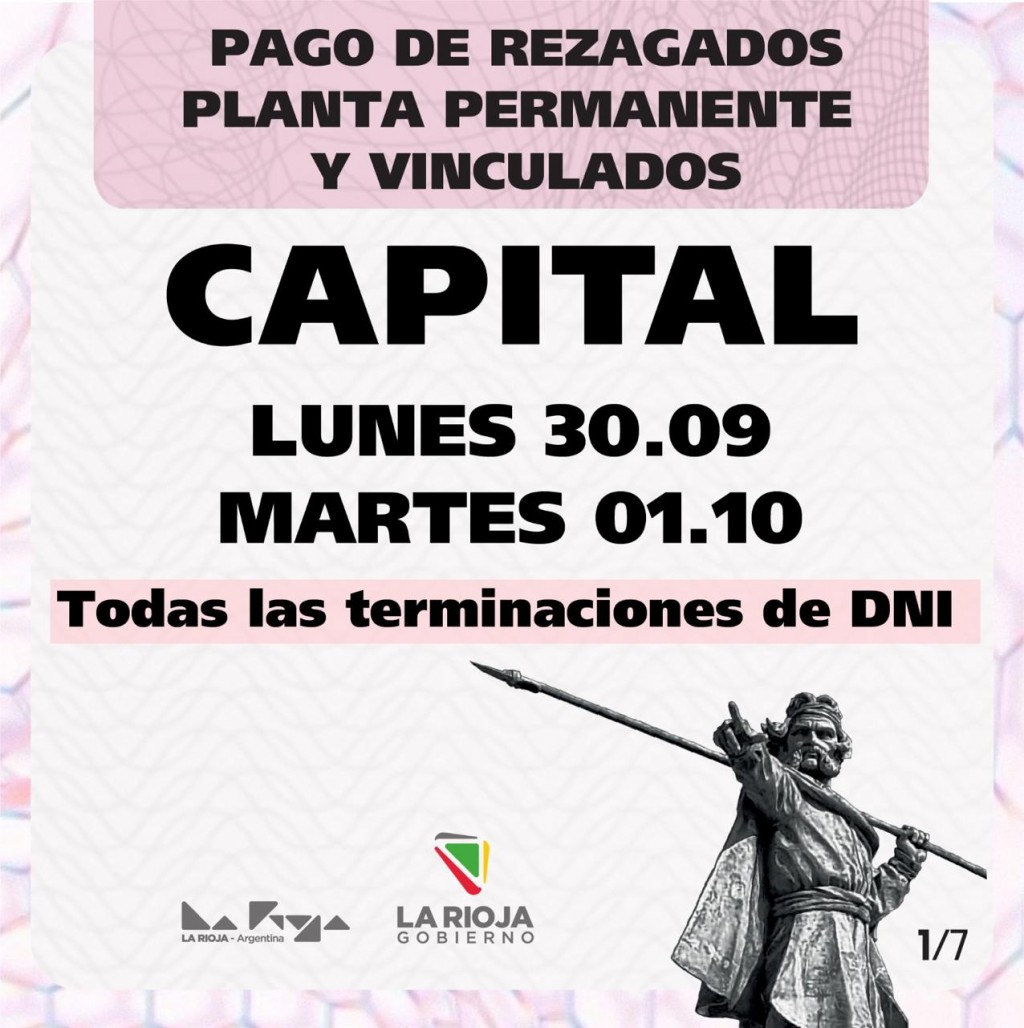 El lunes 30 de septiembre, el pago a rezagados en el interior se realizará en los departamentos: Arauco, en el Salón de la Cultura, de 8 a 9 hs, cobrarán las trabajadoras y trabajadores de Villa Mazán y de 9:30 a 11, de Aimogasta; Independencia, de 8:30 a 9:30 hs, en la Municipalidad de Patquía; Ángel Vicente Peñaloza, de 10:30 a 11:30, en la Escuela N°168 de Punta de los Llanos, de 11:30 a 12:30 hs en el CIC de Tama y de 13:30 a 14:30 en la Escuela N°318 de San Ramón; San Blas de los Sauces, de 12 a 13 en la Municipalidad de Salicas; Castro Barros, de 14:30 a 15:30 en la Municipalidad de Aminga y Sanagasta, de 17 a 18 hs en la Municipalidad de Sanagasta.