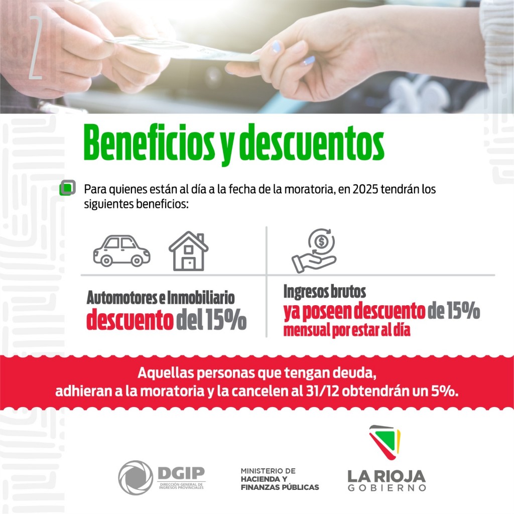 El funcionario remarcó que esta ley se distingue por contar con importantes beneficios a los contribuyentes que estén al día, ya que "quienes cumplan en los impuestos automotor e inmobiliario se les otorga un descuento adicional para el año que viene del 15 %, más allá de lo que ya tienen por estar al día al 31 de diciembre y para quienes cancelen la moratoria antes que termine el año, van a tener un 5% de descuento para el año entrante".