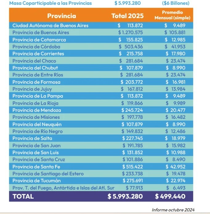 El presupuesto 2025 proyecta una recaudación total de $ 175 billones. Excluyendo los Derechos de Exportación e Importación, el Impuesto s/ Créditos y Débitos Bancarios. y demás tributos y tasas con asignaciones específicas (pero de menor cuantía), esta masa de recursos se distribuye según los parámetros de la Coparticipación Federal de Impuestos.