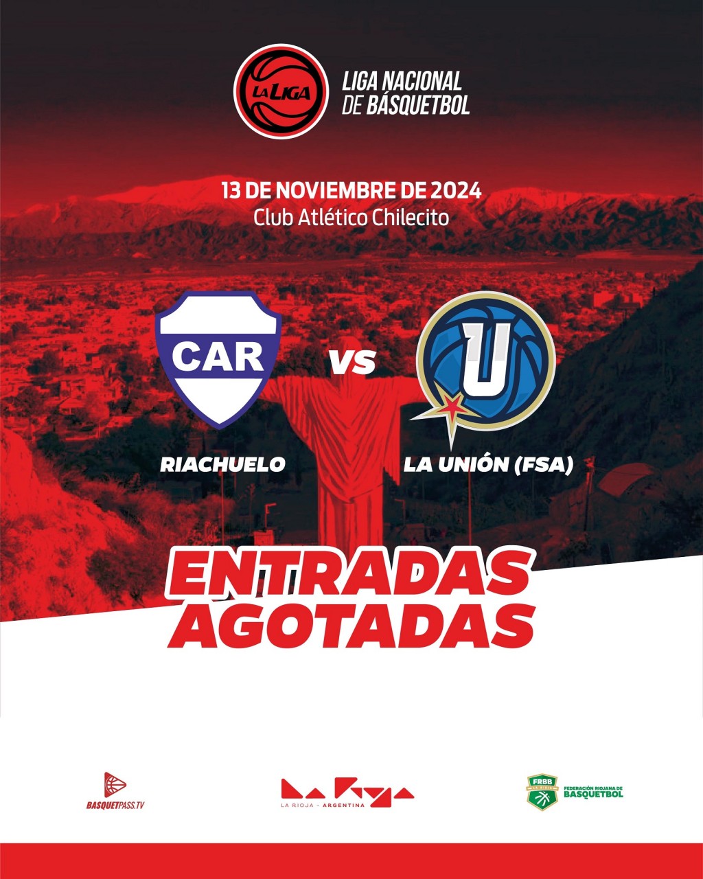 El Club Atlético Riachuelo recibirá este miércoles desde las 21.30 hs a La Unión de Formosa en cancha del Club Atlético Chilecito, por una nueva jornada de la Liga Nacional de Básquetbol. Con entradas agotadas, desde la organización se informó que no se venderán entradas en boletería, por lo que se solicita a la comunidad no acercarse a los accesos en caso de no poseer entradas para el espectáculo deportivo.
