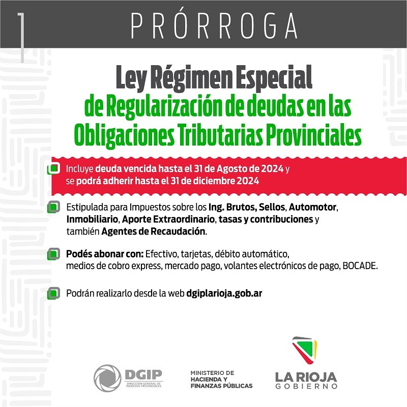 La Direccion Gral. de Ingresos Provinciales extiende el plazo de adhesión a la Ley de Régimen Especial de Regularización de Deuda en las Obligaciones Tributarias Provinciales hasta el 31 de diciembre de 2024. Esta prórroga brinda a las y los contribuyentes una nueva oportunidad para regularizar sus deudas vencidas, abarcando diversas obligaciones impositivas.