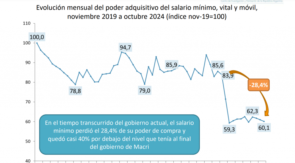 Según el informe del Centro de Investigación y Formación de la República Argentina (CIFRA), el salario mínimo, vital y móvil tuvo una pérdida brutal de poder adquisitivo apenas asumido el gobierno actual, producto del efecto de la devaluación de la moneda y su impacto en los precios. Advierte además que a casi un año del gobierno de Milei, no se vislumbra ninguna recuperación de dicho salario.