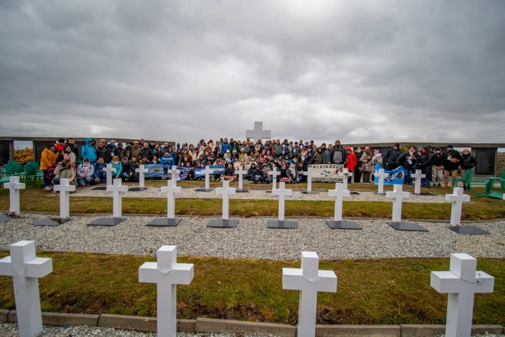 El grupo viajó a la madrugada de éste miércoles en un Boeing 737 chárter, de la empresa Andes, hacia las Islas Malvinas y aterrizó en el aeropuerto de Monte Agradable a las 06:30 horas para luego ser trasladado al cementerio de Darwin en donde se encuentran enterrados los restos de 238 de los 649 combatientes caídos durante el conflicto del Atlántico Sur ocurrida en 1982.
