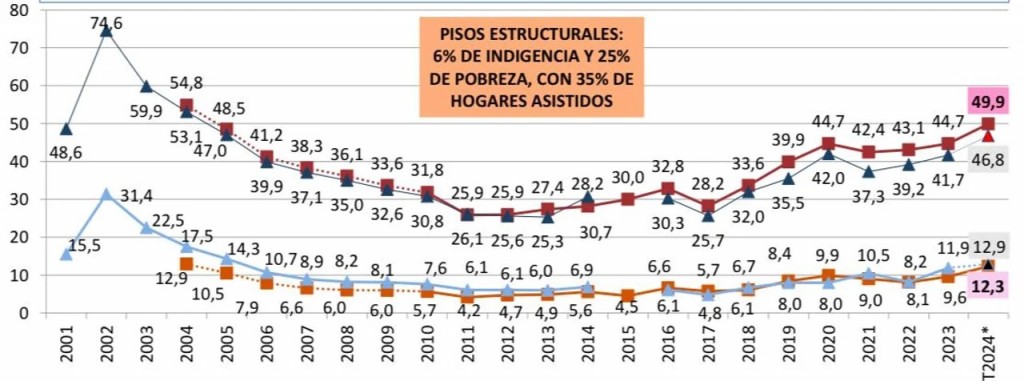 La baja de la pobreza “no necesariamente se expresa en mayores niveles de consumo debido a que hay un incremento del gasto en servicios”, agregó y explicó que "entre 2022-2023-2024 aumentó la proporción de personas en situación de indigencia y pobreza. En tanto que en las infancias, la pobreza e indigencia, relevó que actualmente 2 de cada 10 niños viven en pobreza extrema".
