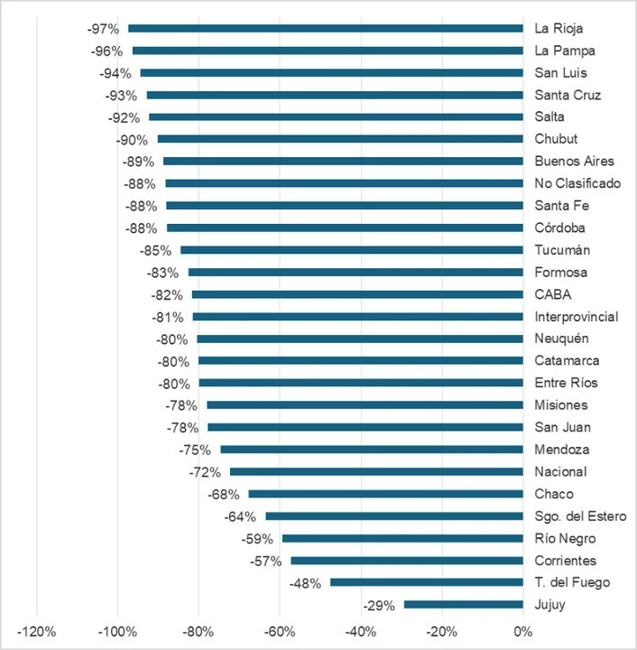 Todas las jurisdicciones experimentaron reducciones en términos reales, pero los porcentajes de variación muestran que algunas provincias lograron sortear mejor los efectos de la inflación que otras. Son los casos de Jujuy y Tierra del Fuego, que presentan caídas reales menores al promedio nacional (-29% y -48%, respectivamente), y que contrastan con los retrocesos superiores al 80% observados en provincias como Córdoba, Santa Fe o Buenos Aires.