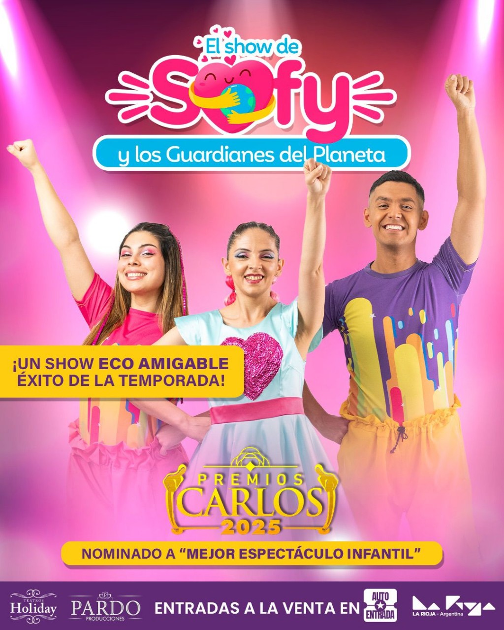 El debut de “El Show de Sofy y los Guardianes del Planeta” en villa Carlos Paz significó un gran paso de la artista y productora riojana, pero que no terminó ahí ya que la obra ha sido nominado en la categoría de mejor espectáculo infantil en la edición 2025 de los Premios Carlos.