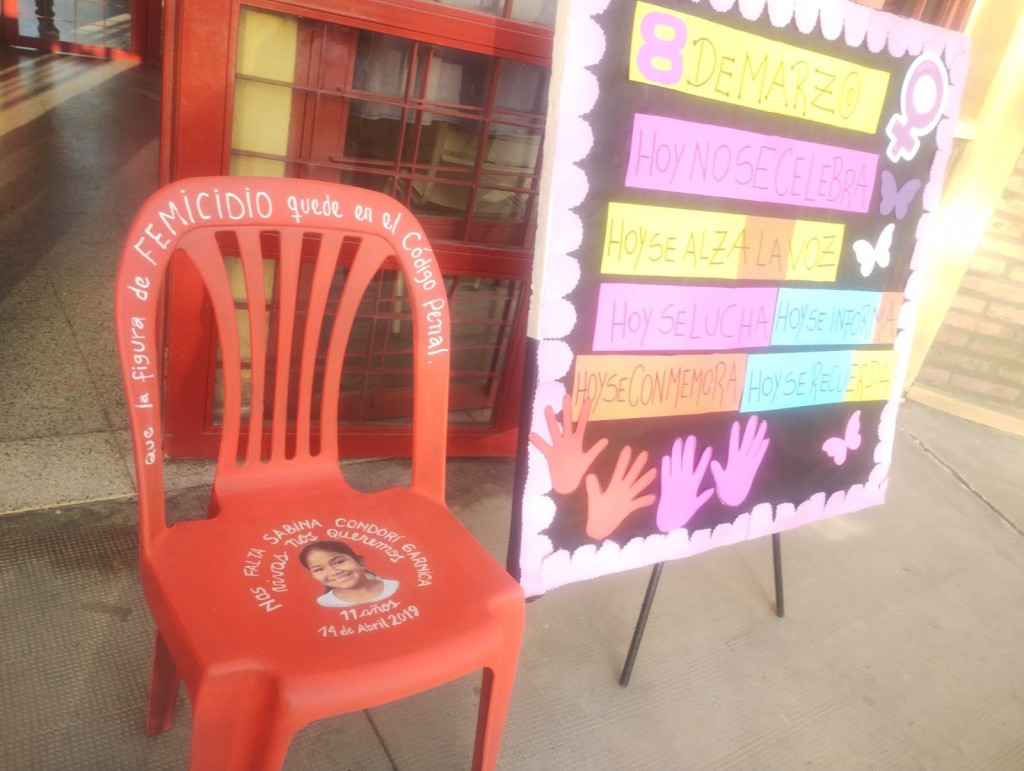 El homenaje se realizó en la escuela a la que asistía Sabina, la ñiña de 11 años. En la oportunidad el Secretario Delfor Brizuela junto a su equipo hizo entrega a la institución educativa de una silla roja con la fecha del asesinato de la pequeña, frases reflexivas y un texto alusivo a la importancia de mantener la figura del femicidio en el código Penal, en referencia a la insistencia del gobierno Nacional de eliminar esta figura jurídica.