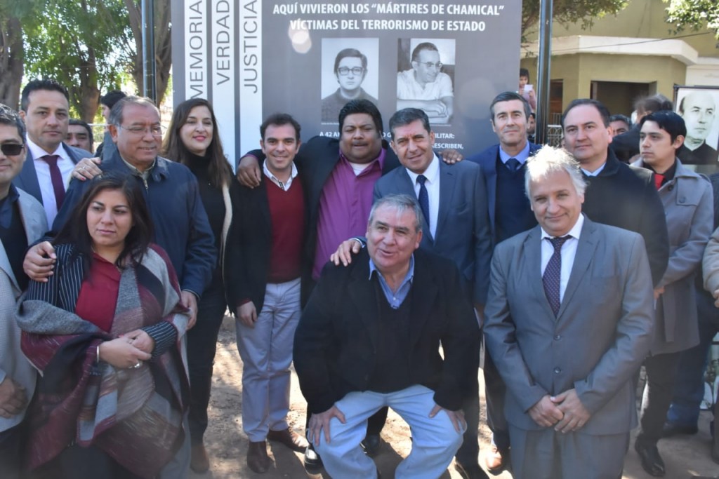 El gobernador Sergio Casas, junto al intendente Daniel Elías, y el director nacional de Sitios de Memoria, Ariel Gomplewick, encabezaron el acto de declaración de Sitio de Memoria a la casa parroquial, "Lugar donde vivieron los Mártires de Chamical, víctimas del terrorismo de Estado".
