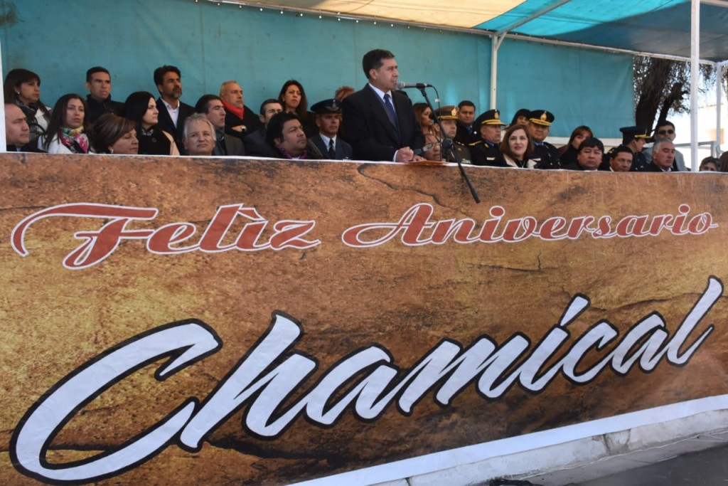 El gobernador Sergio Casas, encabezó el acto central por el 63° aniversario de la declaración de Chamical como ciudad y en la ocasión reiteró la importancia del proyecto del Corredor Bioceánico que contempla la instalación de un puerto seco en esta ciudad. Pidió por los fondos necesarios para el crecimiento de la provincia.