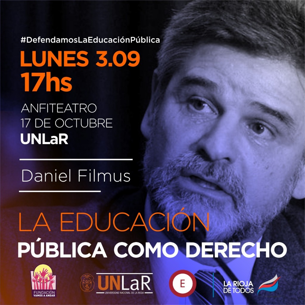 A las 17, Daniel Filmus, disertará sobre "La Educación Pública como Derecho" en el Anfiteatro 17 de Octubre en la Universidad Nacional de La Rioja, con el objetivo de analizar la realidad que atraviesa Argentina sumida en una profunda crisis económica, cuyas medidas de ajuste antentan contra el derecho al acceso a una educación pública, gratuita y de calidad para todos los habitantes de este país.