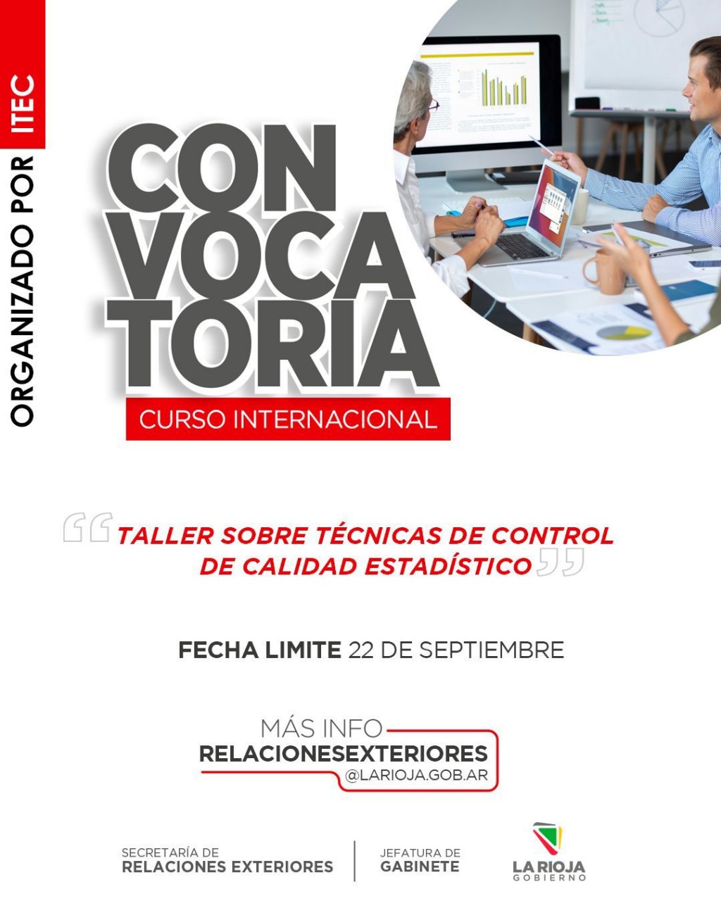 La Secretaría de Relaciones Exteriores, junto a la Jefatura de Gabinete del Gobierno de La Rioja, lanzó una serie de convocatorias para participar en cursos internacionales de formación organizados por ITEC, destinados a fortalecer capacidades en áreas clave como gestión financiera, transformación digital, emprendimiento, desarrollo urbano y control de calidad estadístico.