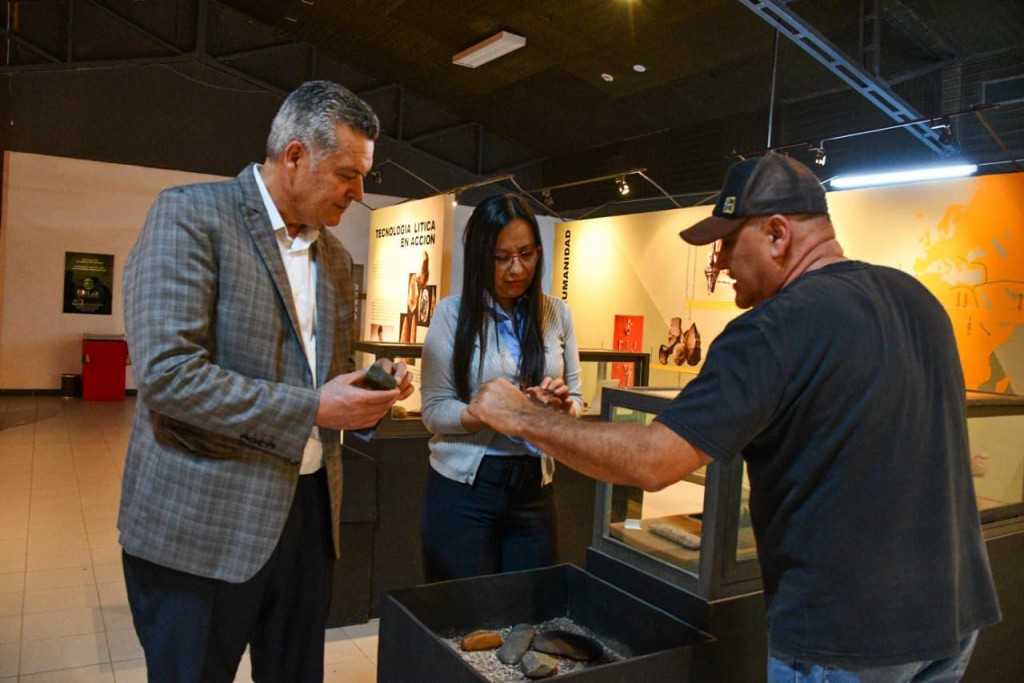 El ministro de Turismo y Culturas, Gustavo Luna, acompañado por la rectora de la UNLaR, Natalia Ãlbarez Gómez, escuchan atentamente la explicación de uno de los trabajadores nodocentes de la casa de altos estudios que trabaja en el museo universitario.