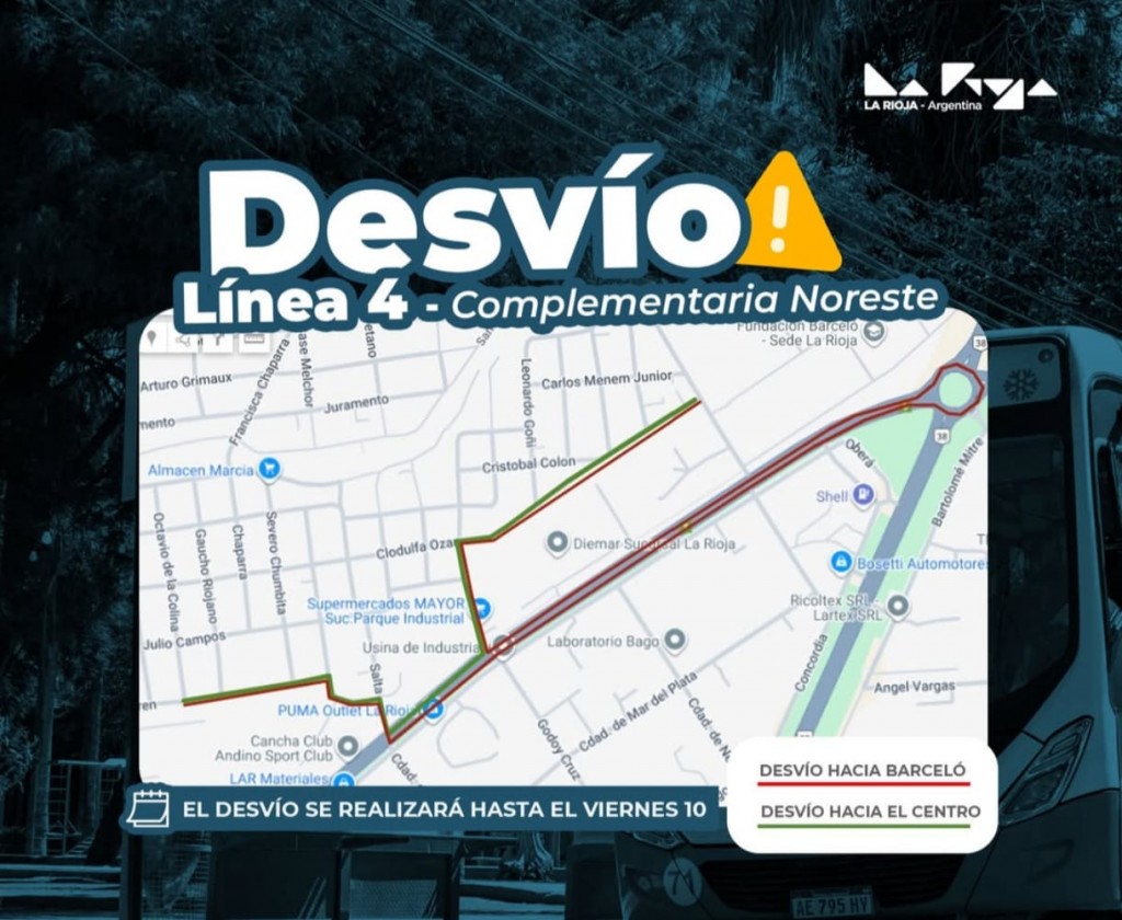 Desde las redes de la empresa riojana se informó que el desvío desde la Fundación Barceló al centro es por calle Clodulfa Ozan, dobla en Padre Martín Gomez hacia la Avenida Juan Manuel de Rosas, sigue por Salta, Guillermo Treolar y Guillermo Iribarren, y sigue su recorrido normal. En tanto desde el centro a la Fundación Barceló es el mismo desvío en sentido contrario.