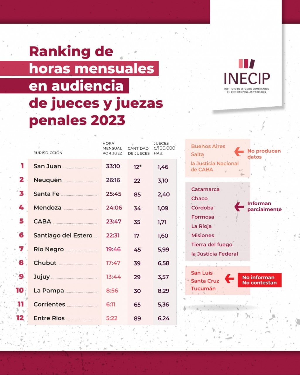 El Instituto de Estudios Comparados en Ciencias Penales y Sociales (INECIP) presentó la segunda edición de su microinvestigación: “Horas en audiencia de jueces y juezas penales de la Argentina” y la provincia de San Juan se ubica entre las que más horas dedica a éstos menesteres. Asimismo hay provincias que informan parcialmente y otras que directamente no brindan nada de información al respecto