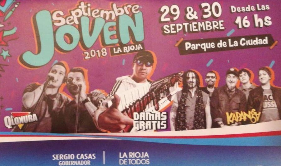 El Sábado 29 estarán en el escenario Q’Lokura, El Suceso, Manzana, El Guachon, La Cuartereta, Tinkunaco y varias bandas locales más. El Domingo 30 cerrarán la edición 2018 del Septiembre Joven Kapanga, Damas Gratis, Cuanto Loco, Hitomin Karma y la cantante olteña Ileana Magalevsky. La entrada es libre y gratuita.