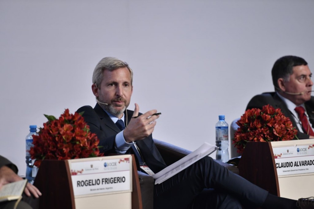 El ministro del Interior, Obras Públicas y Vivienda, Rogelio Frigerio, cerrará su participación en la Asamblea de la Organización para la Cooperación y el Desarrollo Económicos (OCDE) que se realiza hasta hoy en Lima, Perú, en donde encabezó un panel sobre acceso a la información pública y gobierno abierto y en donde destacó los mecanismos impulsados por el Gobierno nacional para lograr más transparencia en las obras públicas.